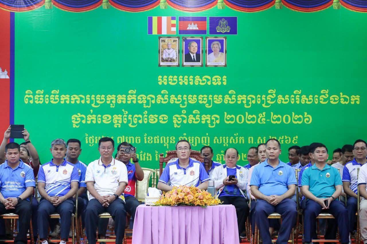 (ព្រៃវែង)៖ នាព្រឹកថ្ងៃទី១០ ខែមីនា ឆ្នាំ២០២៦នេះ ឯកឧត្តម សួន សុម៉ាលីន អភិបាលនៃគណៈអភិបាលខេត្តព្រៃវែងបានអញ្ជើញជាអធិបតីក្នុងពិធីបើកការប្រកួតកីឡាសិស្សមធ្យមសិក្សាជ្រើសរើសជើងឯកថ្នាក់ខេត្ត ប្រចាំឆ្នាំសិក្សា ២០២៥-២០២៦។ ពិធីនេះមានការអញ្ជើញចូលរួមពីសំណាក់ លោក លោកស្រី អភិបាលរងខេត្ត ថ្នាក់ដឹកនាំមន្ទីរជុំវិញខេត្ត កងកម្លាំងប្រដាប់អាវុធ លោកគ្រូ អ្នកគ្រូ និងក្មួយៗសិស្សានុសិស្សជាកីឡាករ កីឡាការិនីយ៉ាងច្រើនកុះករ។